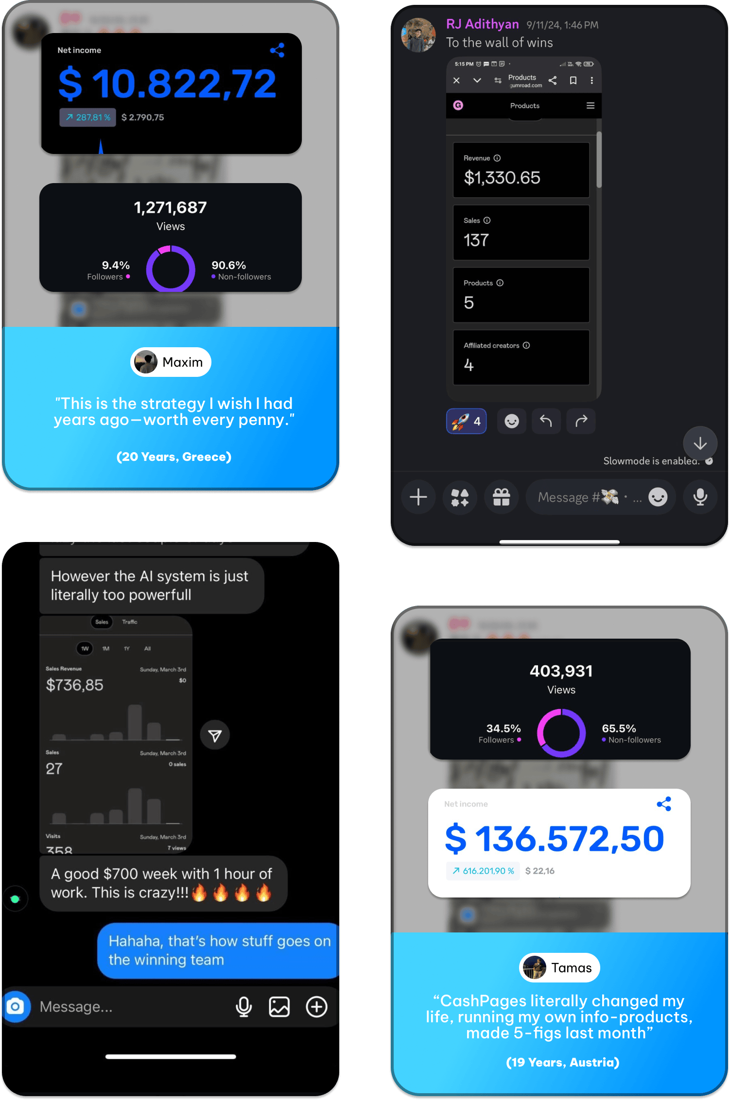 De la création du compte à l’évolution de votre page, nous vous guidons pas à pas. En plus, vous aurez un accès privé aux meilleurs créateurs et gestionnaires de CashPages, qui partagent leurs stratégies inédites.